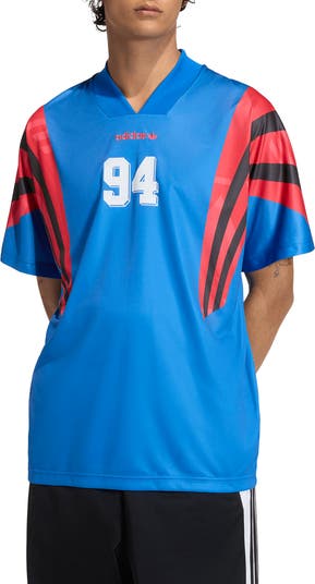 Inspired by archival soccer styles and ready to kick up your everyday style game, this jersey made entirely of recycled fibers features a roomy fit that lets you move and relax in comfort. A soft V-neck, angled stripes and gradient colors on the sleeves bring fresh energy to any favorite look.