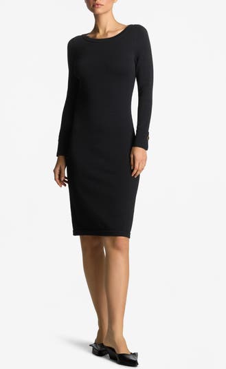 This versatile sweater-dress from the label's 'Foundation' collection inspires everyday confidence with its impeccable fit and a knit that holds it shape. A subtle bateau neck and enameled buttons at the cuffs add an easy elegance to the knee-grazing look.