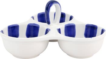 Add the warm allure of the Mediterranean to your table with this ceramic three-bowl serving dish highlighted by Greek-inspired blue dots.