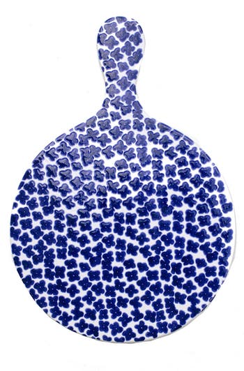 A floral motif inspired by the colors and beautiful mosaic tiles of the Greek Isles enhances the rustic appeal of this ceramic cheese board that adds easygoing elegance to your appetizer table.