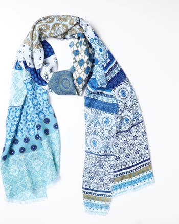 This eye-catching accessory features a harmonious blend of intricate Mediterranean-inspired prints in cool tones of blue, white, and soft taupe. The patchwork design brings together traditional patterns and modern elegance, making it a perfect statement piece for any outfit. Crafted from lightweight, breathable fabric, this generously sized scarf offers versatile styling options—drape it over your shoulders as a shawl, loop it as a scarf, or wear it as a chic wrap for breezy evenings. Whether you're dressing up denim or adding flair to a neutral ensemble, this scarf is your go-to for effortless sophistication.