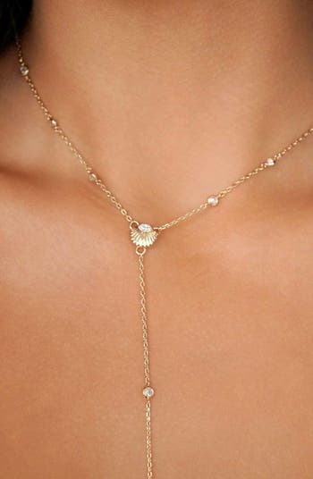Round cubic zirconia highlight this drapey Y-necklace punctuated with a shell pendant for natural, sea-inspired charm.