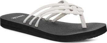 Hints of metallic shimmer accent the strappy upper of a beach-ready flip-flop set on a comfortable footbed inspired by a cushy yoga mat that supports each step you take.