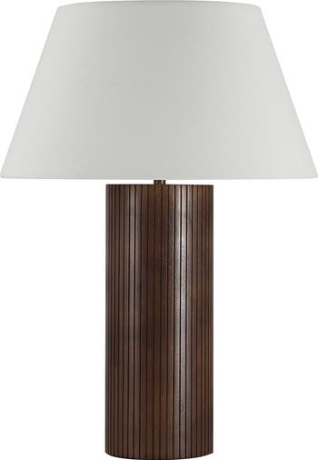 Perfect for end tables or consoles, this dimmable table lamp combines walnut wood and ivory linen to create an elegant balance of dark and light.
