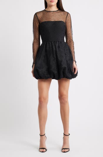 Lustrous studs enhance the party-perfect vibe of this bubble-hem mini made with a sheer yoke and sleeves.