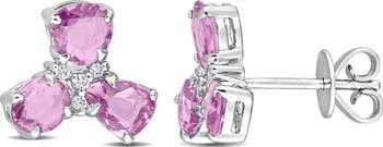 These pretty sapphire and diamond accent stud earrings are crafted in 14k rose gold (option in 14k white gold). These earrings feature 6 fancy shaped pink sapphire (option in purple) and 8 round-cut diamonds that are beautifully embellished on the center of the earrings. Enhanced with a high polished finish, these earrings are secured with butterfly closures. Elevate your style with timeless charm and modern grace.