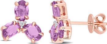 These purple sapphire and diamond accent 3-stone stud earrings are a perfect fit for those who love wearing small and minimal. They are crafted in glistening 14k rose gold and feature two round-cut diamonds in the center surrounded by six fancy-cut purple sapphire gemstones in a 3-stone pattern. Polished to a brilliant shine, these are secured with butterfly clasps. Pair these pretty studs with any look and give a touch of glam to your ensemble.