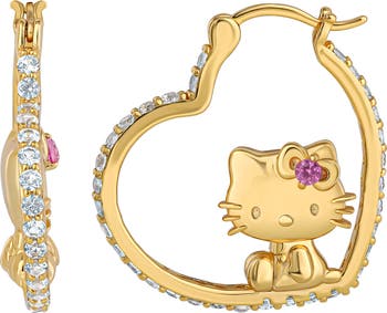 Make a sweet statement with these heart-shaped Hello Kitty hoop earrings in gold tone, featuring the iconic face with a pink bow.