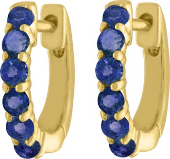 A stream of blue sapphires adds intense color to these gleaming huggie earrings crafted from 14-karat gold.