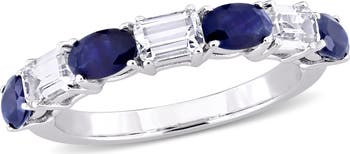 Experience elegance with this Semi-Eternity Ring in 14k Gold. This exquisite ring showcases a combination of oval-cut sapphire gemstones and emerald-cut white sapphires elegantly set in lustrous 14k gold. With its timeless design and captivating sparkle, it represents enduring grace, making it a cherished piece for celebrating special occasions and the beauty of everlasting love.