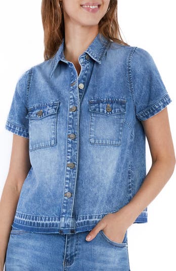 This staple season-spanning shirt is cut from faded denim and framed with abbreviated sleeves.