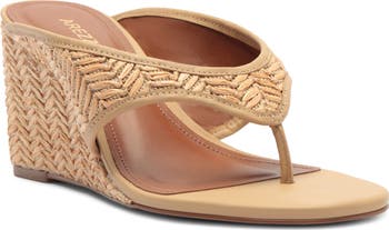 Smooth faux leather and finely woven raffia bring textural interplay to a Brazilian-made flip-flop lofted by a chunky wedge heel.
