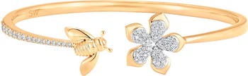 A sweet bee compliments a diamond-filled flower on the ends of this 18-karat gold cuff that brings sunny organic inspiration to your ensembles.