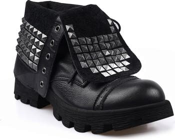 Pyramid studs highlight the foldover cuff of a lug-sole bootie that completes your look with moto-chic attitude.