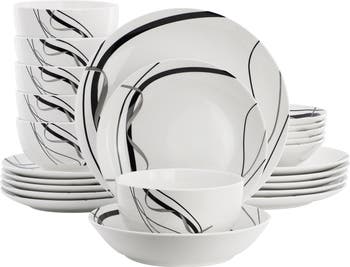 Enjoy your every day meals in style with the Elama Sarah 24 Piece Porcelain Dinnerware Set for Six people. This set is designed with a mix of gray and black ribbon graphic lines adorning each dish, making each meal stand out a little extra. Sturdy porcelain construction with a glazed finish makes this set both durable and elegant. Whether you are serving your family or having guests over, this set is perfect to use for any occasion. The porcelain construction makes each piece dishwasher and microwave safe for no fuss cleaning and easy re-heat. Including six dinner plates, six salad plates, six cereal bowls, and six soup bowls, the Elama 24 piece dinnerware set comes with everything you need for your dining needs. So set the table and enjoy as you let the graphic design of each piece frame your culinary creations in just the right way!