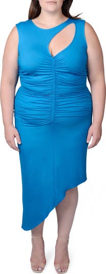 A chest cutout and an asymmetric hem show off some skin in a party-ready dress with a shirred body-con silhouette.