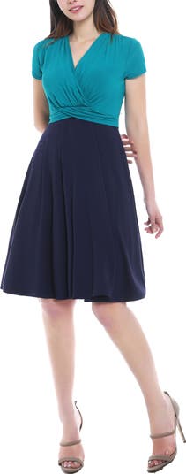 This adorable baby-doll dress features a surplice neckline that cleverly conceals nursing details. Light gathers on the shoulders and a faux wrap belt adds some trendy attributes to this soft knit fabric in a casual color block.