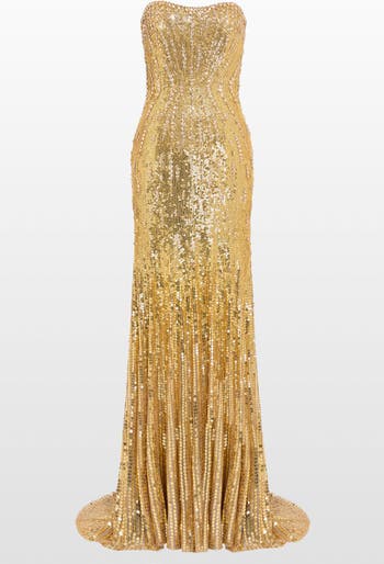Steal the spotlight in this stunning strapless gown, a shimmering masterpiece of glamour and sophistication. Adorned with intricate sequins that cascade from the fitted bodice to the floor-length hem, this gown creates a radiant, light-catching effect. The streamlined silhouette skims the figure beautifully, while the strapless neckline adds a touch of timeless allure and modern elegance.