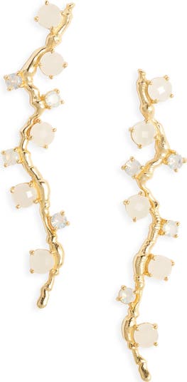 Faceted prong-set quartz and moonstones add shimmer and shine from top to bottom of statement-making stud earrings handcrafted in Hawaii with an 18-karat gold-plated finish.