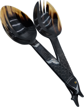Reel in a touch of coastal elegance with this exquisite sardine serving set, hand-carved from buffalo horn. Lightweight yet durable, each piece showcases the unique marbling and rich tonal variations of the horn, making every set a one-of-a-kind treasure. The sleek, polished finish lends a sophisticated edge to your spread, perfect as a salad server or as a serving utensil set. Whether for an intimate dinner or a lavish gathering, this set brings artisanal charm to the table because even the smallest details should make waves. Material: Buffalo Horn Dimensions: 11" x 3" x 1.5" inches