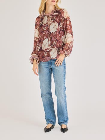 This captivating top in a rich raisin combo print combines vintage-inspired florals with modern design elements. Crafted from fluid 100% viscose, it features a striking circular ruffle neckline, expertly shaped with hidden fish wire for a perfectly structured look.