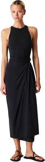 The adjustable wrap creates fluid texture along the front of this slip on midi dress. Unlined and weightless, it is a captivating piece transitions easily through the formal, semi-formal, and everyday. This custom fabric features a premium organic cotton expertly knit together with lyocell. The lyocell in this fabric uses wood pulp from FSC-certified suppliers ensuring the protection of ancient and endangered forests. During fiber production, special attention is placed on a closed loop cycle, reducing and recovering the water, chemicals, and energy used.