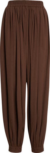 These silk seersucker trousers, drawing inspiration from traditional harem pant styles, balance volume with a comfortable elastic waist and tapered ankles.