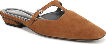An adjustable T-strap provides a secure fit on a leather mule featuring a slender square toe and streamlined profile.
