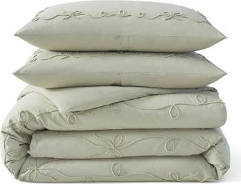 Invite cozy, vintage-inspired vibes into your bedroom retreat with this set charmingly decorated with scrolling cord embroidery in a sweet bow pattern.