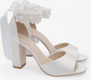 - This satin block heel wedding sandals with a pearl-detailed strap that blends bridal elegance and effortless comfort.