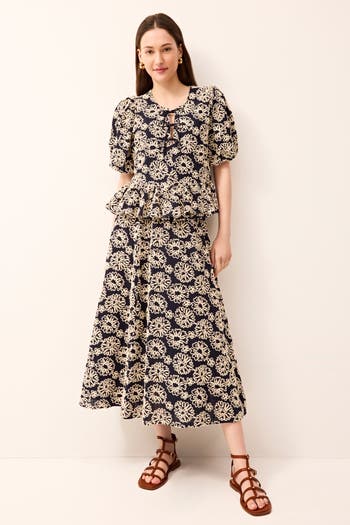 Voluminous and feminine, Sasha features an elastic waistband and pockets (!) for all-day comfort. The timeless romance of the midi skirt comes to life in Blossom, an all-over floral embroidery rendered in a classic navy-and-cream palette. Style it as a set with the coordinating Estella top. Elastic waistband sits at natural waist Side seam pockets Floral embroidery stitch detail 85% viscose / 12% linen / 3% lyocell thread Unlined Care Instructions: hand wash with gentle detergent and lay flat to dry or dry clean