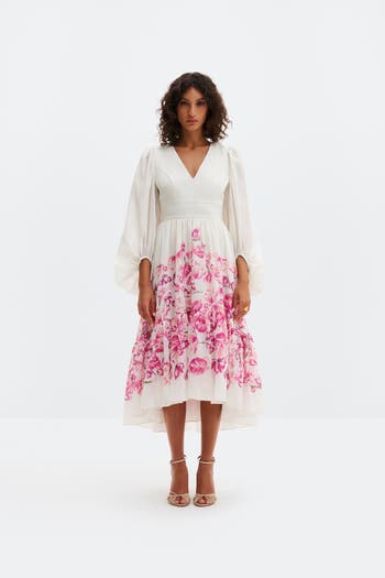 Float through celebrations in a V-neck midi that sculpts the waist, billowed sleeves and a tiered floral skirt that sweeps with graceful movement.
