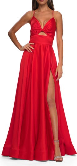 A-line satin prom dress with high slit and cut out below the bust. Banded waist and twist detail on the bust. Open lace up back. Back zipper closure.
