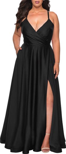 Long satin A-line plus size prom gown with faux wrap top, side leg slit, and pockets. Features an on trend lace up open back. Back zipper closure.