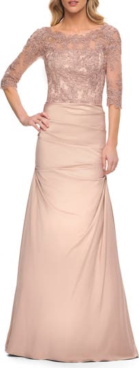 Classic off the shoulder gown with lace bodice and sheer three-quarter sleeves. Skirt is satin with flattering pleats. Back zipper closure.