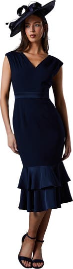 Exuding timeless sophistication, this dress is a refined choice for formal occasions. The sleek silhouette, enhanced by the peplum detail, creates a flattering hourglass shape. Pair it with statement jewellery and heels for a polished look suitable for weddings, races, or any elegant event where you wish to radiate effortless style and grace.