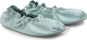 Fringe trim highlights the elasticized topline of this smooth satin sandal that fits to perfection.