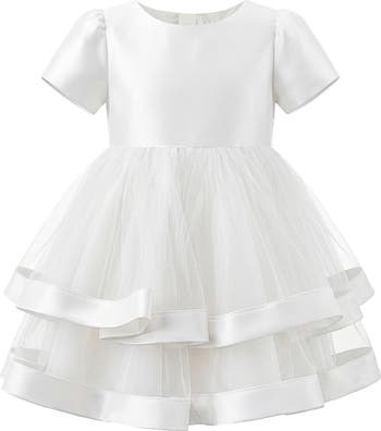 This delicate short-sleeved dress features a plain fitted bodice with a voluminous layered tulle skirt, trimmed with satin ribbons for a refined finish. At the back waistline, a large satin bow adds an elegant focal point, making the design perfect for festive and formal occasions.