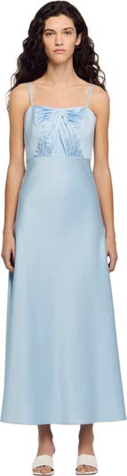 Satin-effect maxi dress with straps and a pleated bustier top, featuring a fitted cut and a floaty, flared skirt.