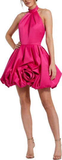 Make a statement in this bold mini dress featuring a halter neckline, open back, and playful bubble hem for a fun, chic look.