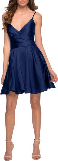 Lovely short satin homecoming dress featuring a flowy skirt and softly pleated bodice. A V-neck and cut our back with corset detailing completes the look. Back zipper closure.