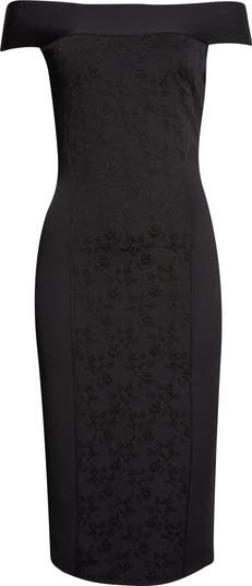 Front and back panels of lacy jacquard bring tonal texture to this slim pencil dress crafted in Italy with a sleek off-the-shoulder neckline.