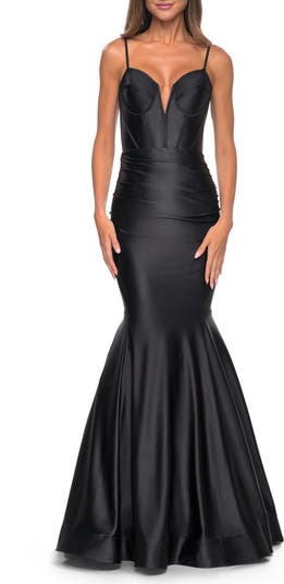 Beautiful stretch satin dress with mermaid skirt and deep V neckline. The top features a corset design and illusion back with exposed boning. Back zipper closure.