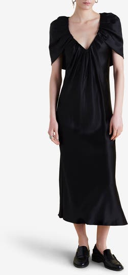 The cape silhouette reinvented. This midi-length dress in our custom lustrous satin features a deep V-neckline and integral hand drape placed effortlessly over the shoulders, mimicking our signature capelet - a forever piece for the fashion collector.