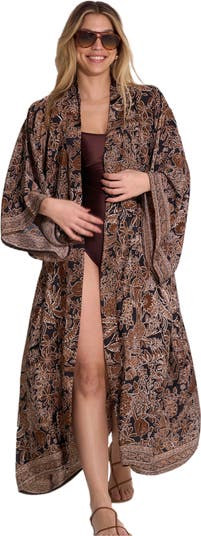 Drift into the dreamy vibes of Satin Shore in the Long Printed Robe Cover-Up. This boho beauty features long wide sleeves, a removable tie belt, and a soft satin-like finish that sways with every breeze. Whether you're lounging seaside or heading to a beachside brunch, it's the perfect layer to elevate your swim look.