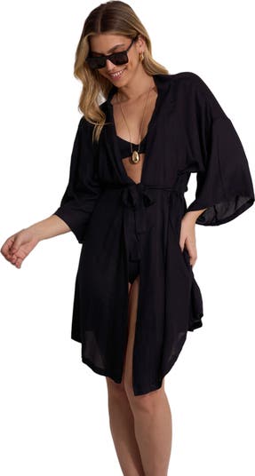 Glide into coastal bliss with the Satin Shore Robe Cover-Up. This boho beach layer features short wide sleeves, a removable tie belt, and a breezy fit, perfect for a polished poolside or beach day look.