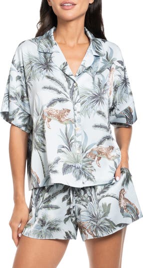 Designed for unhurried nights and brighter mornings, this satin pajama set balances ease and drama in one sweep. A boxy button-up top and relaxed shorts set the flow, then a lavish print turns the whole thing into wearable daydreaming.
