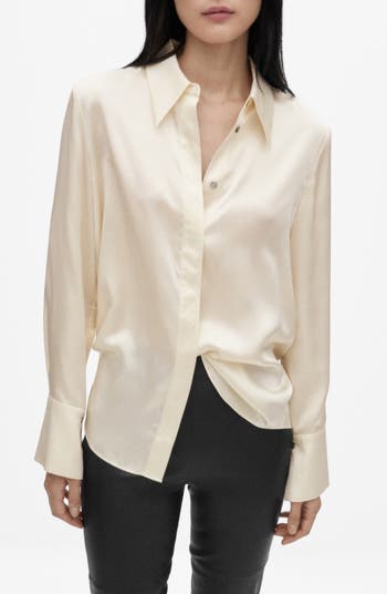 A chic point collar tops this satin button-up shirt cut from luxe silk in a drapey silhouette that radiates polished confidence.