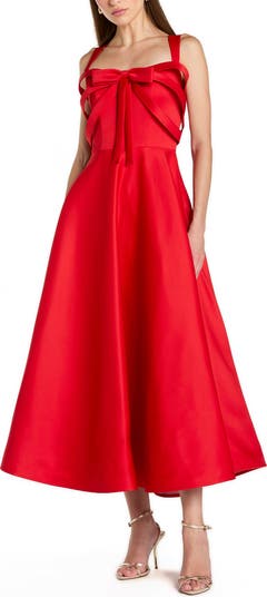 Bold and feminine, this satin dress features a sculpted bow-detail bodice with 3D straps and a flowing A-line skirt for elegant statement style.