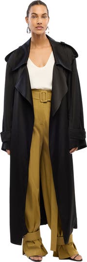 Crafted in a luxuriously soft satin, this lightweight trench takes shape with flap pockets at the chest, featuring a detachable tie belt finished with pleating at the center back. Our Italian textile supplier is known for their “Slow Factory” concept challenging the speed of mass production. To them, manufacturing is a form of art that takes time, precision, and intention. The wood pulp in this viscose comes from FSC-certified producers that protect ancient and endangered forests.